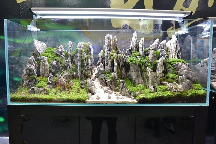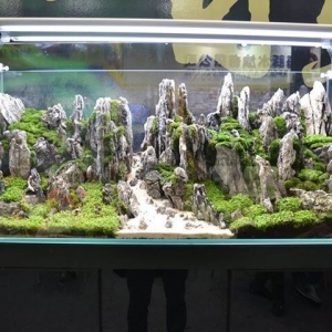 Hồ kích thước 1,2m x50cm x50cm Hồ bố cục đá núi và rêu.